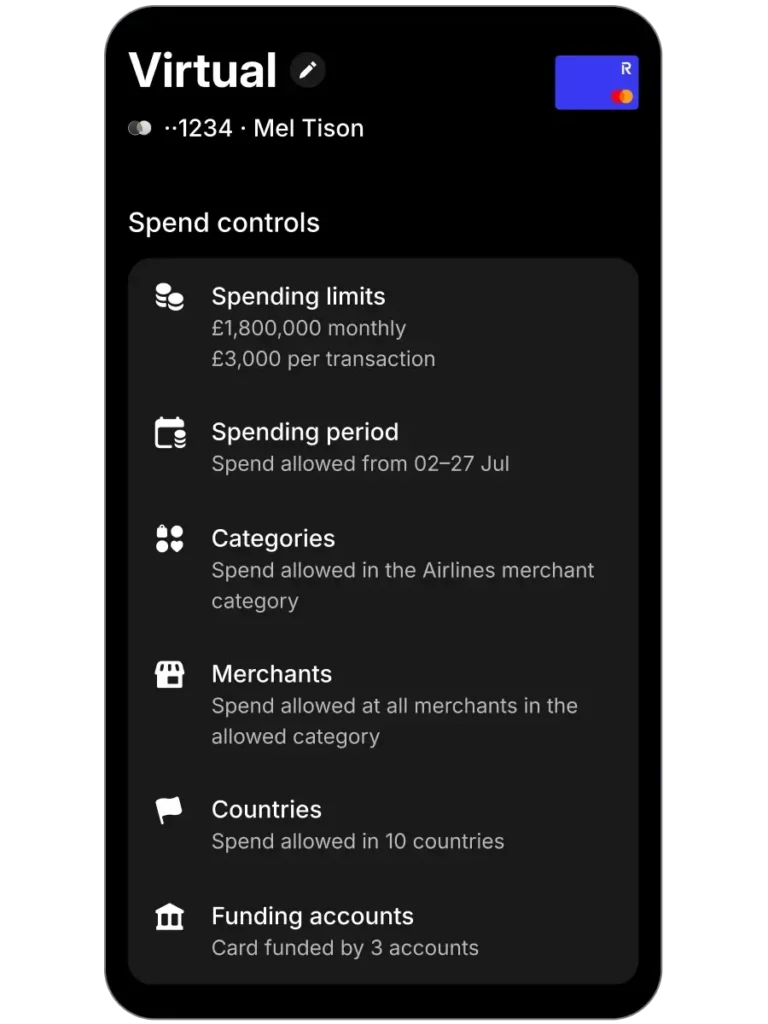 Use custom controls and spend limits on local and global card payments for full control over your spend. That’s peace of mind, built into every transaction.